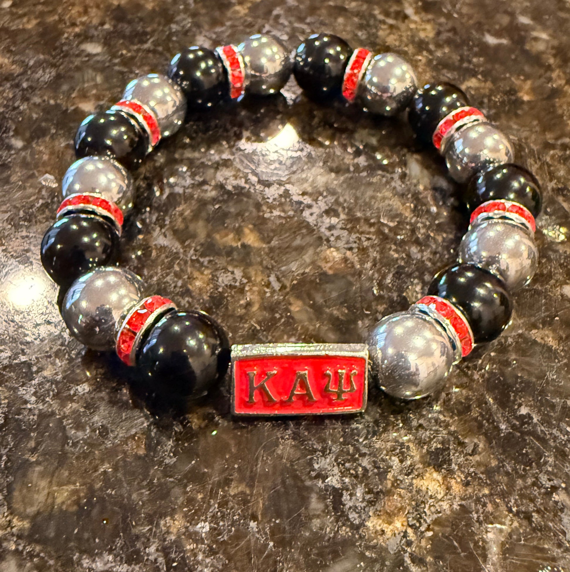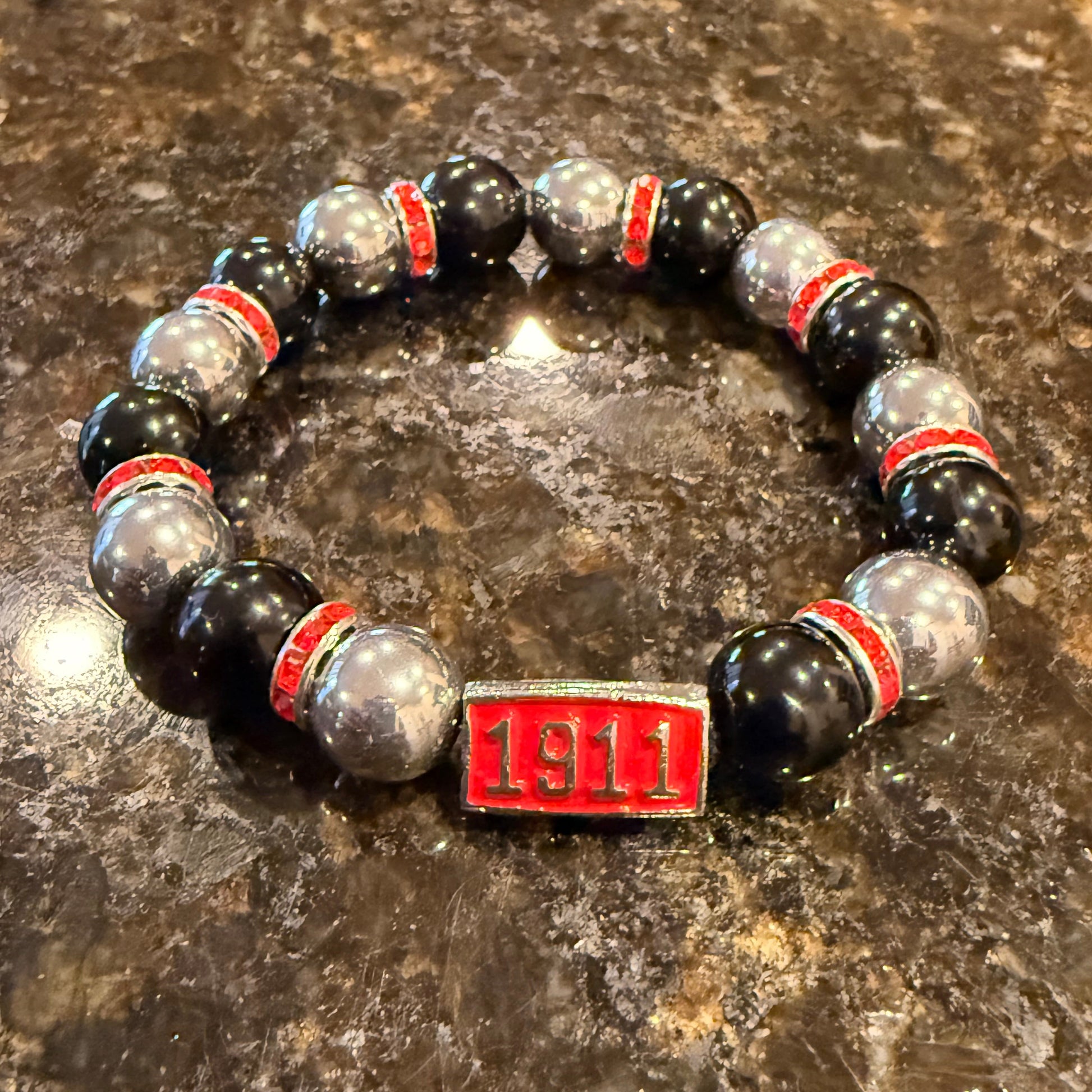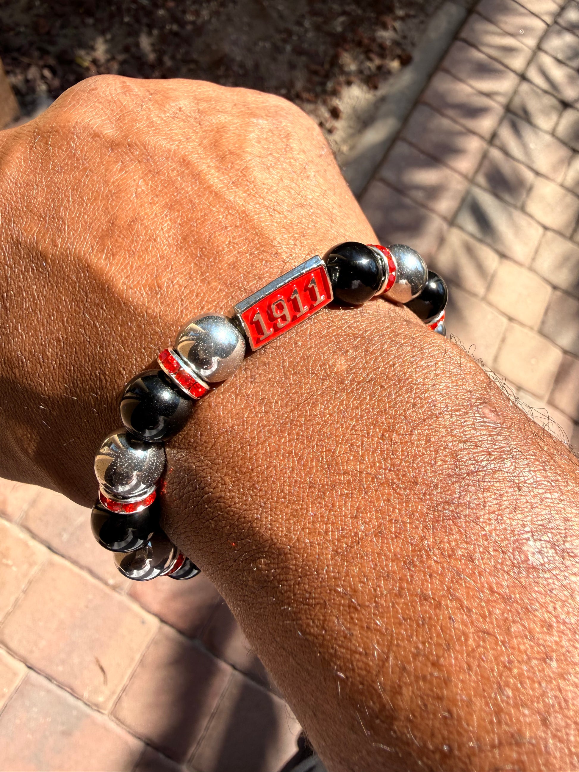 The ΚΑΨ/1911 double sided bracelet features durable black and silver hematite beads, designed for longevity and style. At approximately 8 inches in length, it comfortably fits medium to large wrists, offering both aesthetic appeal and a secure fit for daily wear.