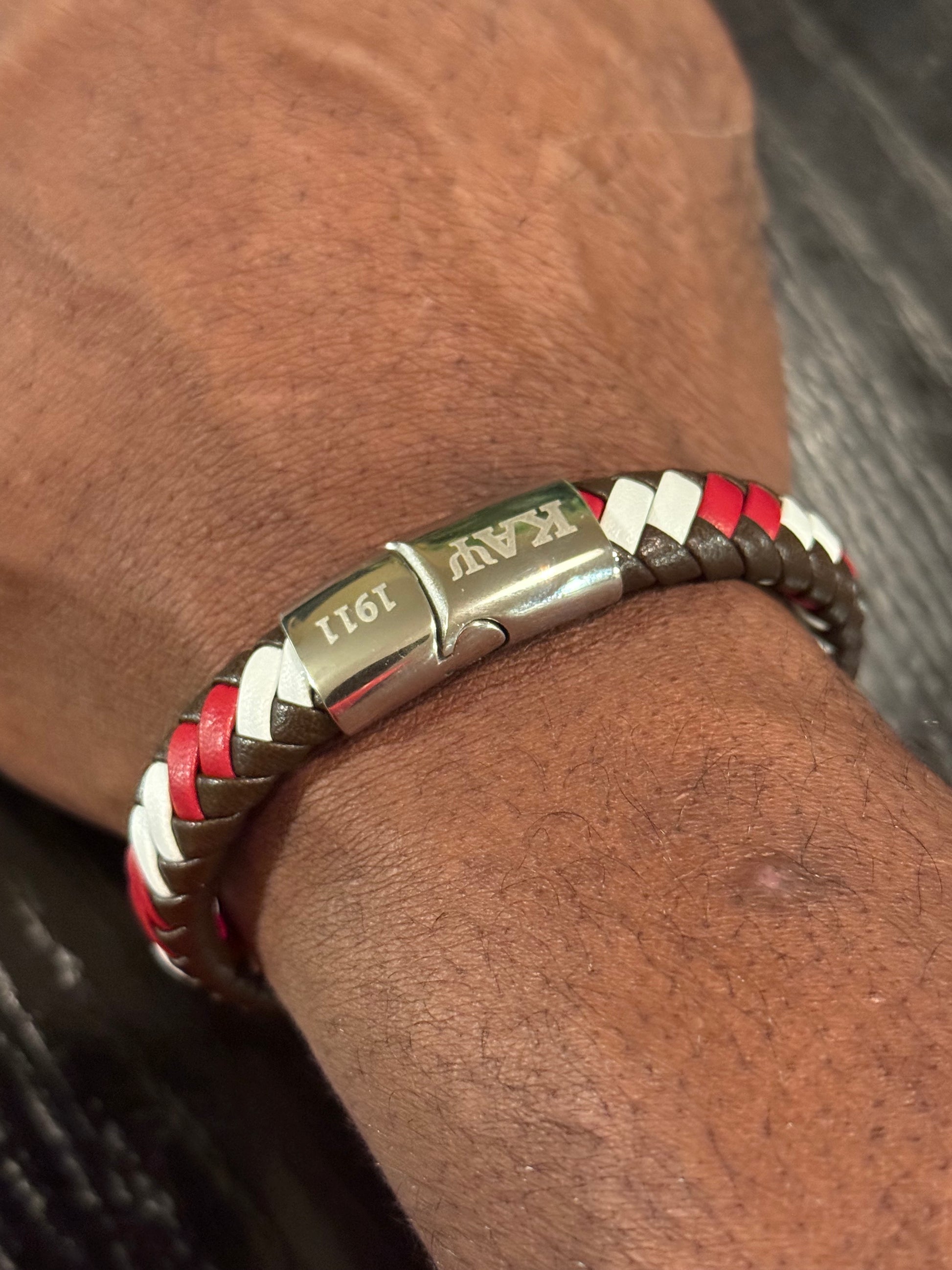 ΚΑΨ 1911 engraved leather bracelet with a unique clasp featuring the emblematic Krimson, Kreme, and Brown colors. Measuring 8 inches, it's designed to fit medium to large wrists. Make a statement and show your brotherhood pride with this exclusive piece. large to medium wrist