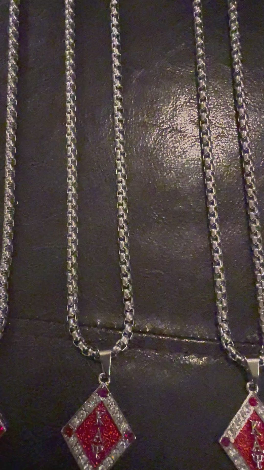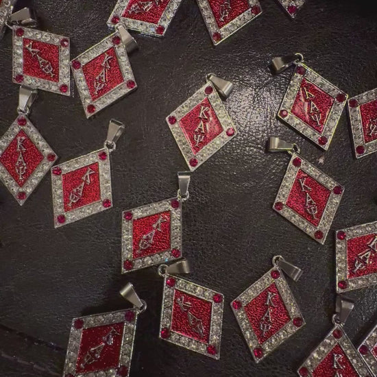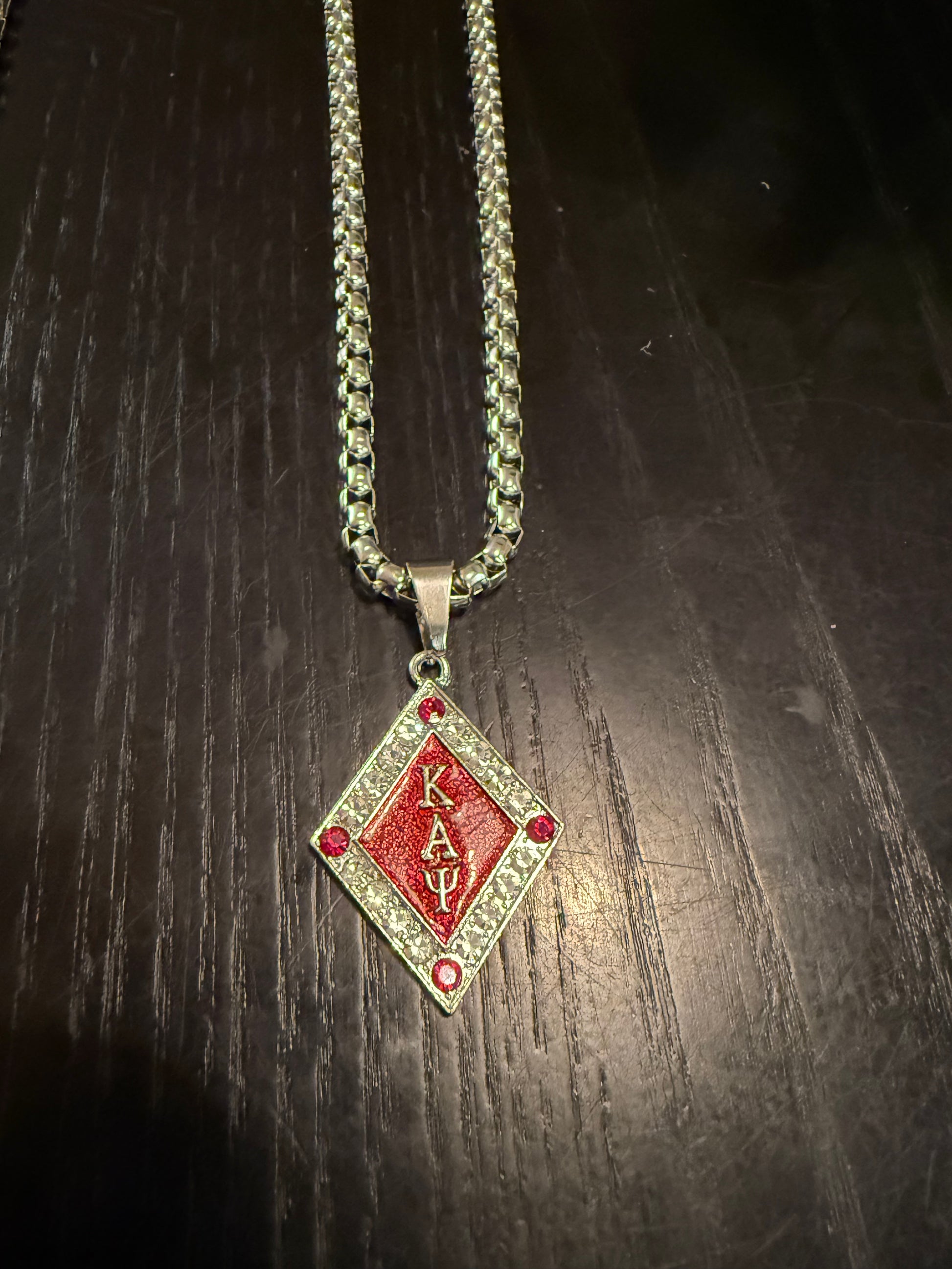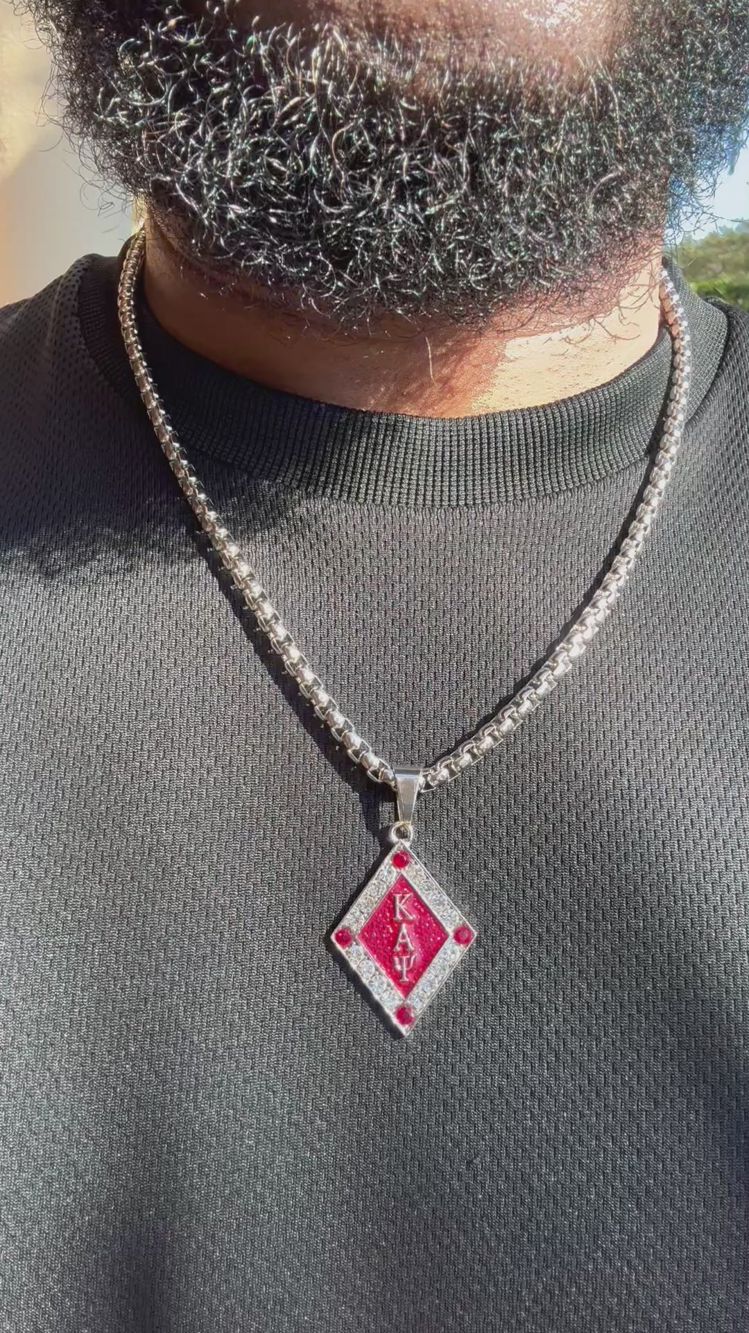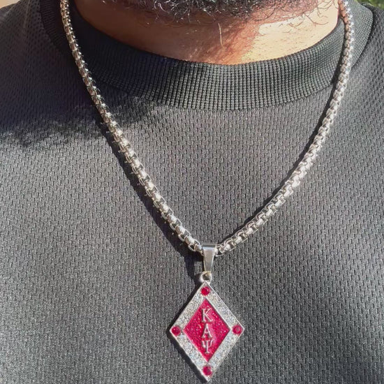 Enhance your style with the striking ΚΑΨ silver and Krimson pendant, suspended on a 22 inch 5mm box chain. Made with high-quality materials and expert craftsmanship, this pendant and chain will elevate any outfit and make a lasting impression. Enjoy a sleek and sophisticated look with this unique accessory.