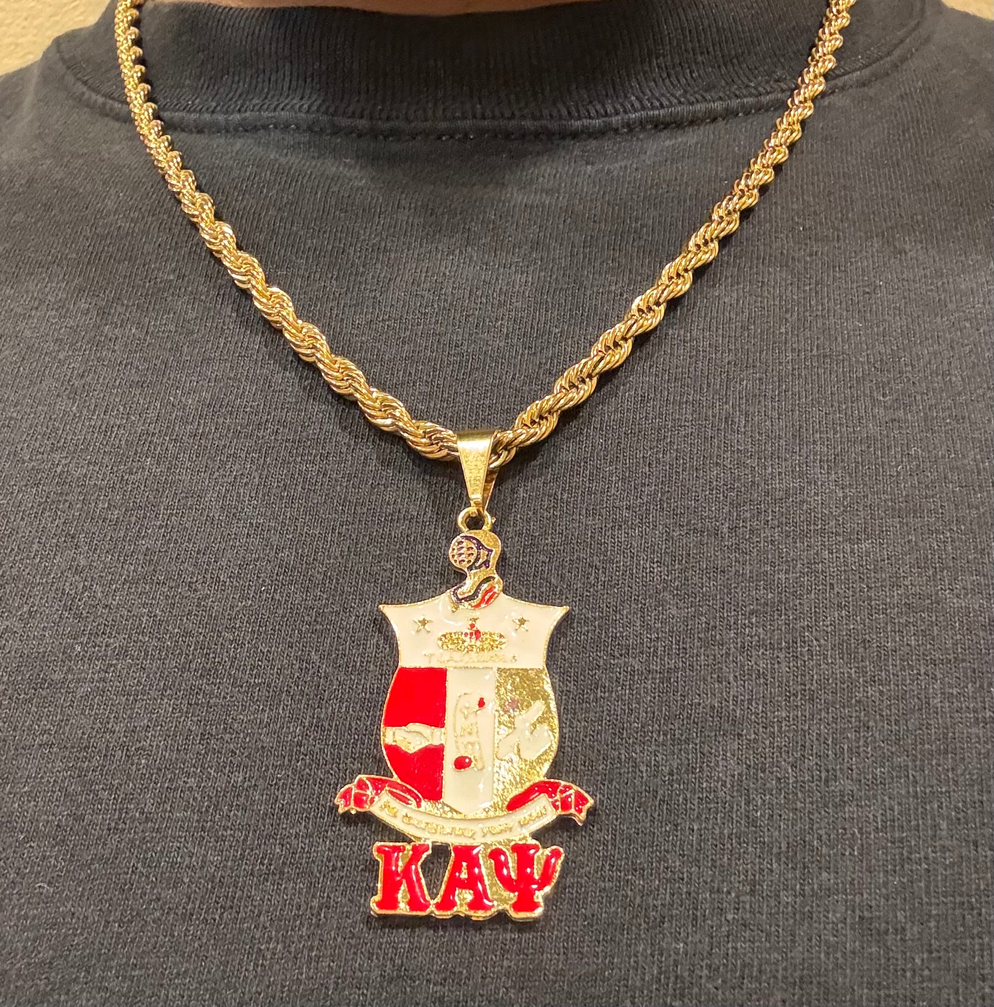 This pendant features a Coat of Arms design, suspended on a strong 22 inch stainless steel 18K gold chain.