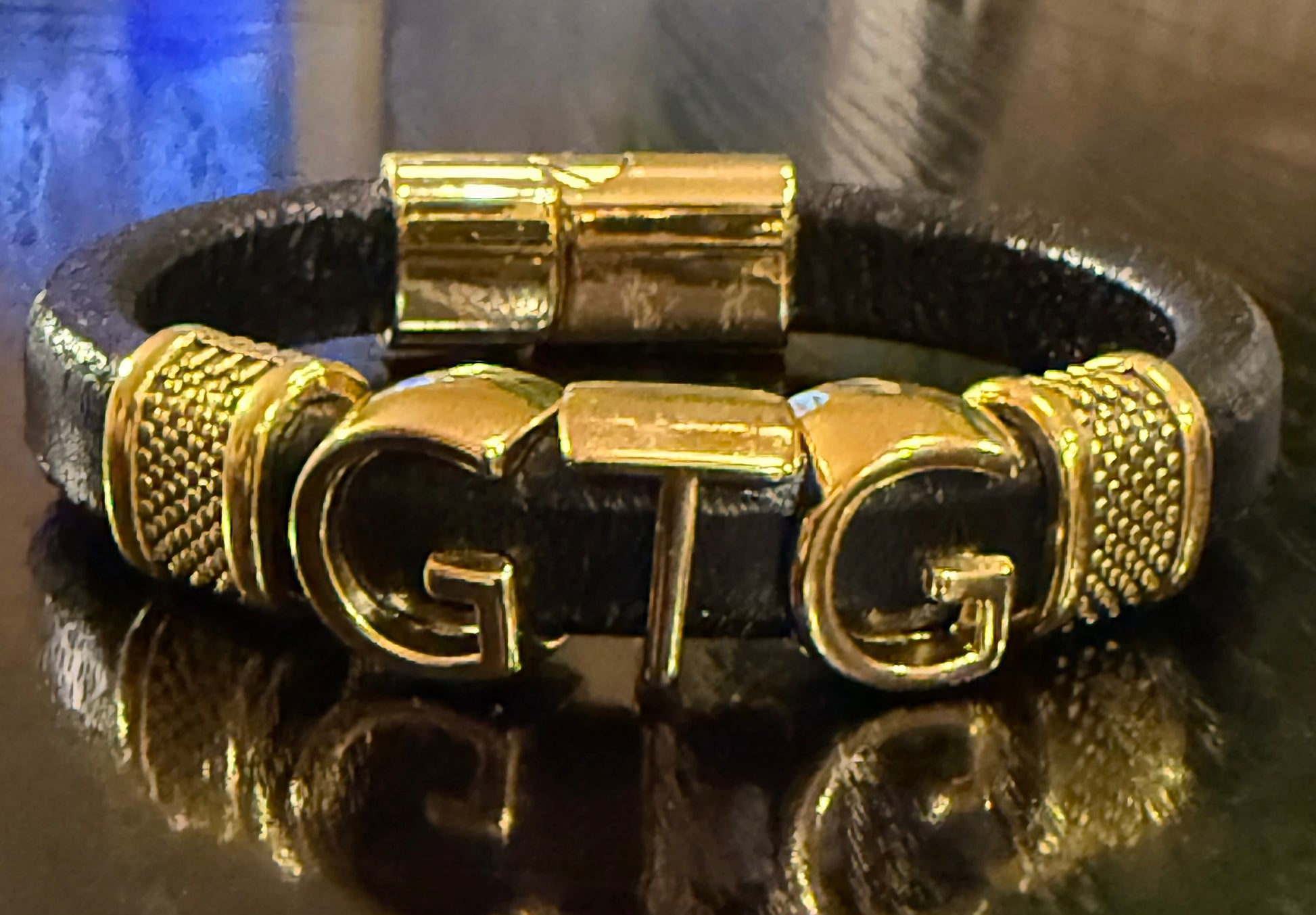Gold Good Time Gang leather bracelet with gold lettering