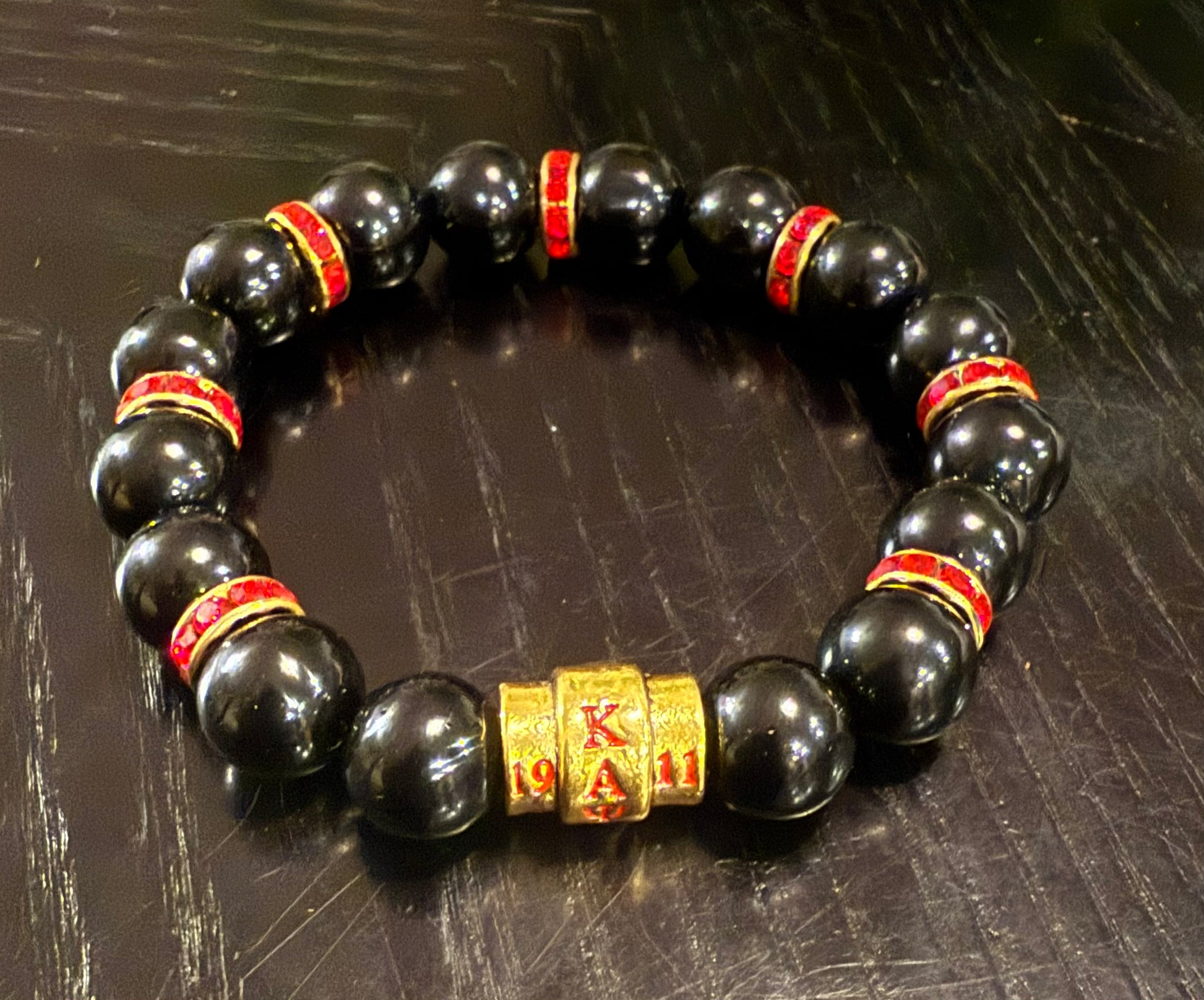 "Expertly crafted with a 12mm black bead design accented by striking red and gold Czech rondelles, the Kappa Alpha Psi gold paver bracelet adds a touch of sophistication and prestige to any outfit. Measuring approximately 8 inches (20cm), it's designed to fit medium to large wrists comfortably.