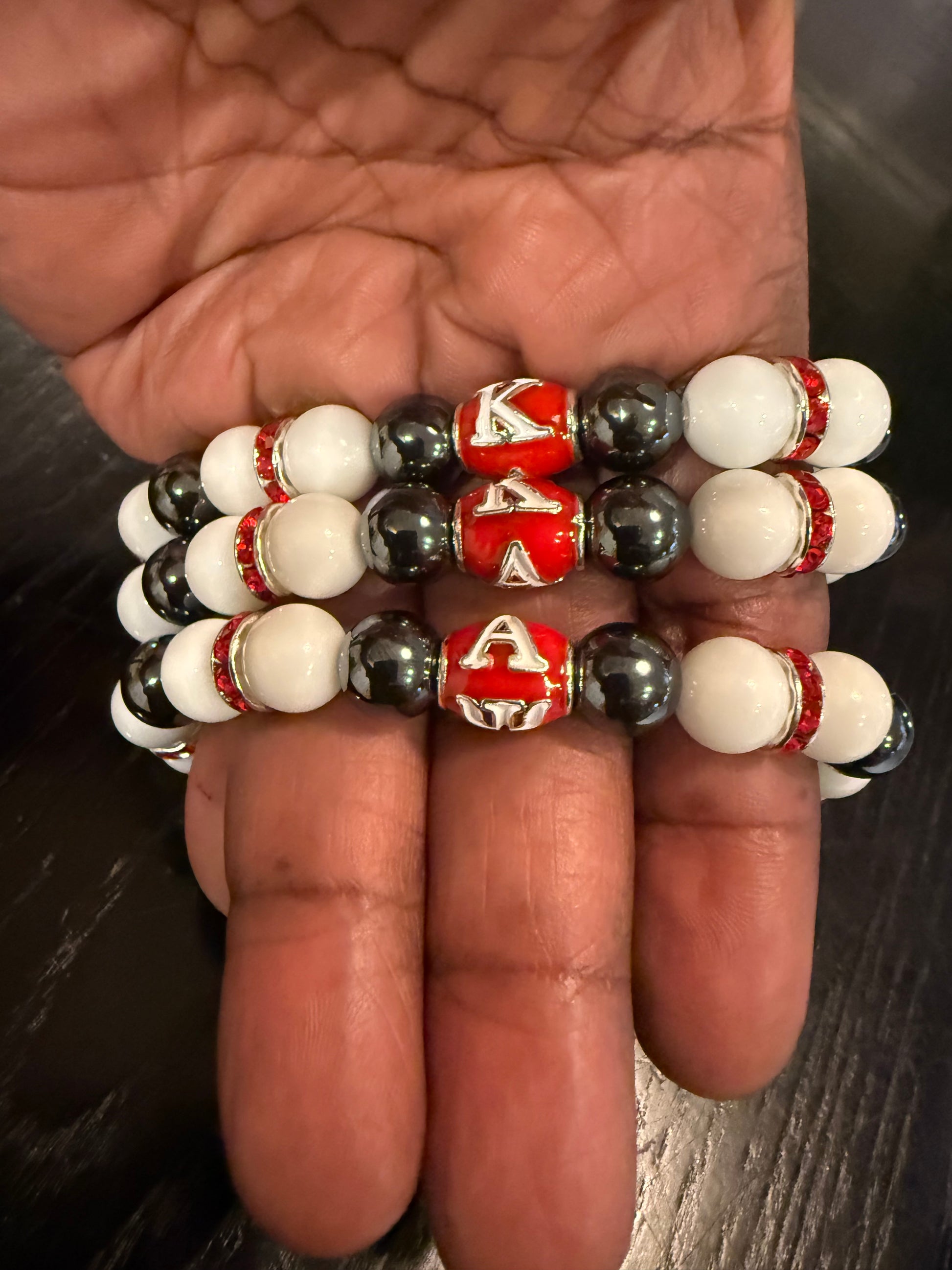 Make a bold statement with this handcrafted Kappa Alpha Psi paver bracelet. Featuring polished black hematite, bright white beads, and vibrant Czech red and silver rondelles, it blends tradition with striking style. Measuring approximately 8 inches, it fits medium to large wrists comfortably.