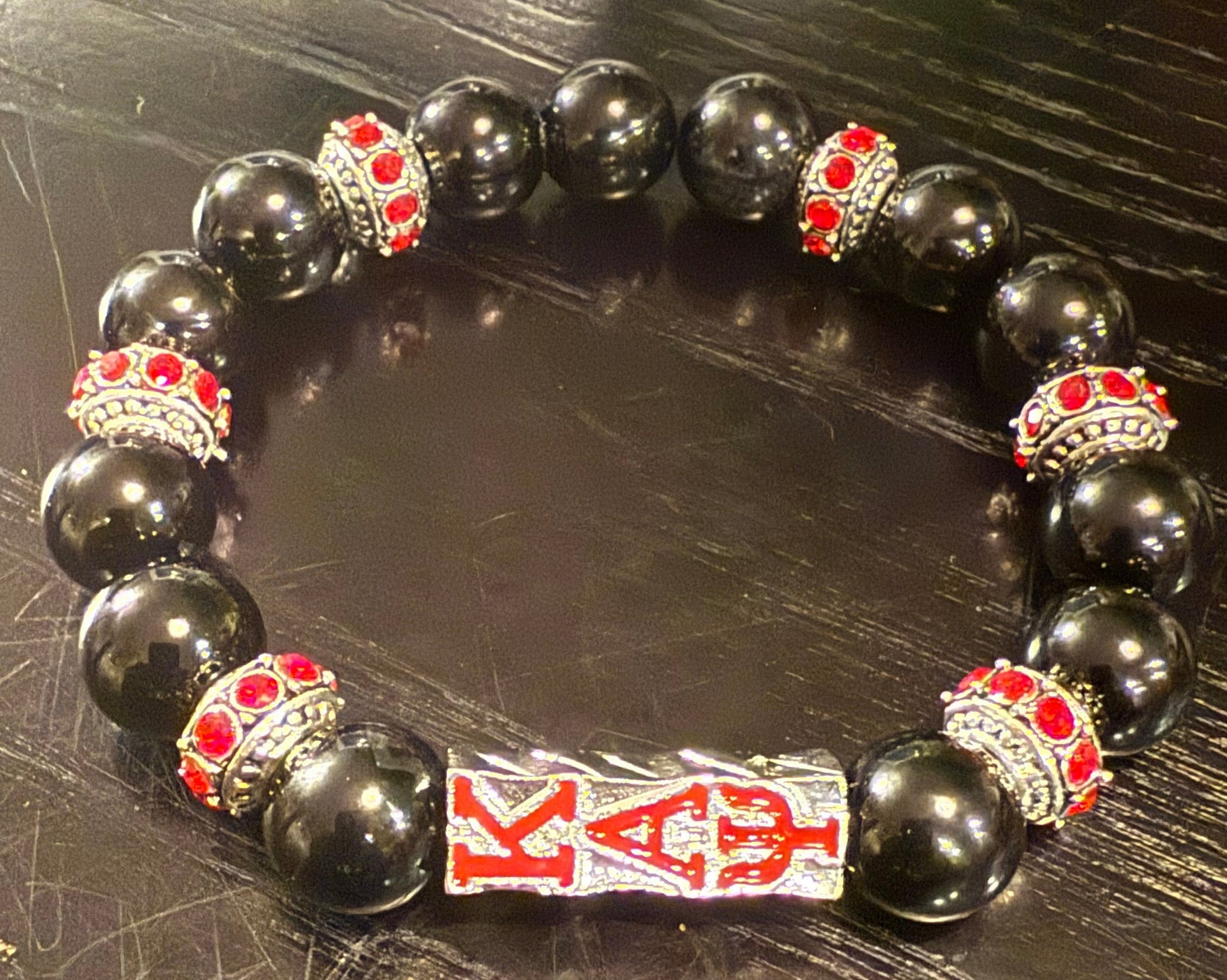 This Kappa Alpha Psi bracelet features glossy black 12mm beads paired with high-quality red gemstone rondelles, crafted to complement medium to large wrists with its 8-inch (20 cm) length.